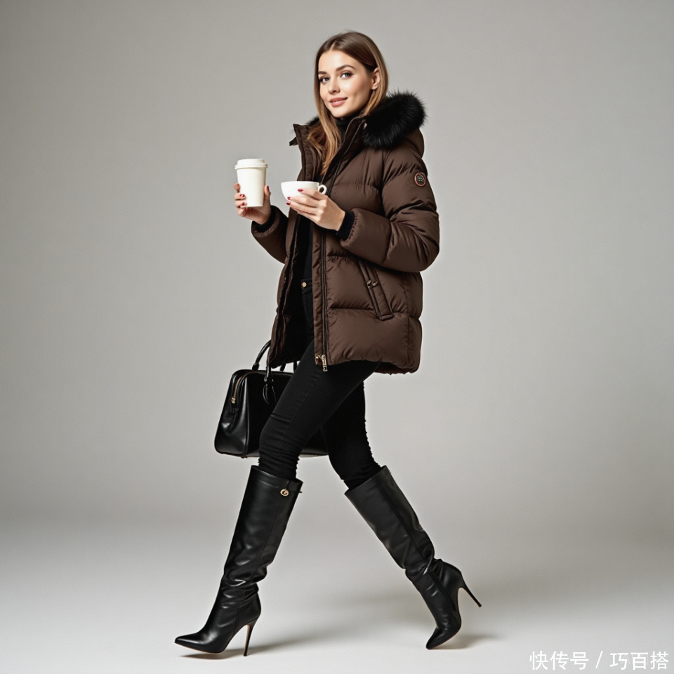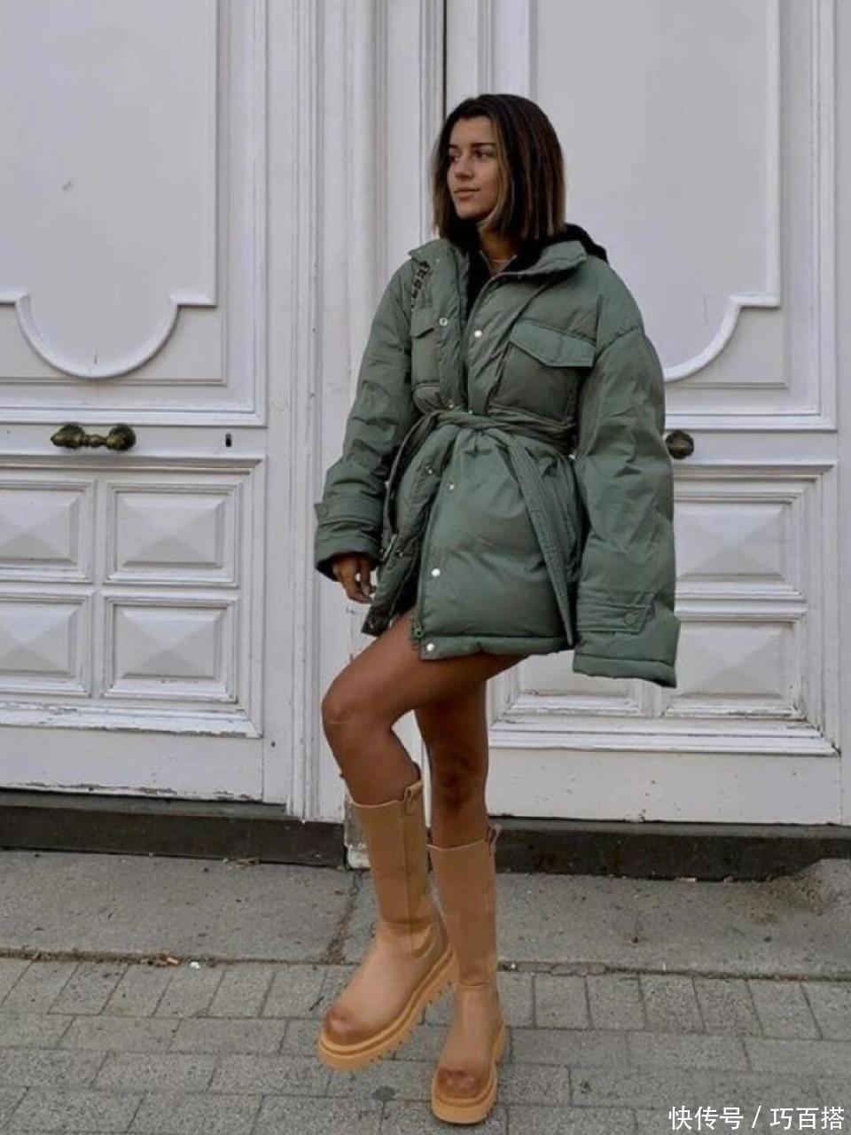 首先,大家可以尝试外扎腰带款羽绒服,高收腰款式既能提高腰线又能减少羽绒服的蓬松度,显高显瘦又精神,保暖的同时又不影响身形的显现,搭配光腿神器和高筒靴,走到哪美到哪!