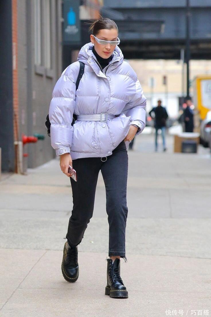 选择短款外扎腰带的羽绒服,大家可以优先考虑搭配直筒半身裙,选择搭配紧身微喇裤效果也很精致,搭配修身直筒牛仔裤在氛围呈现上也足够日常。